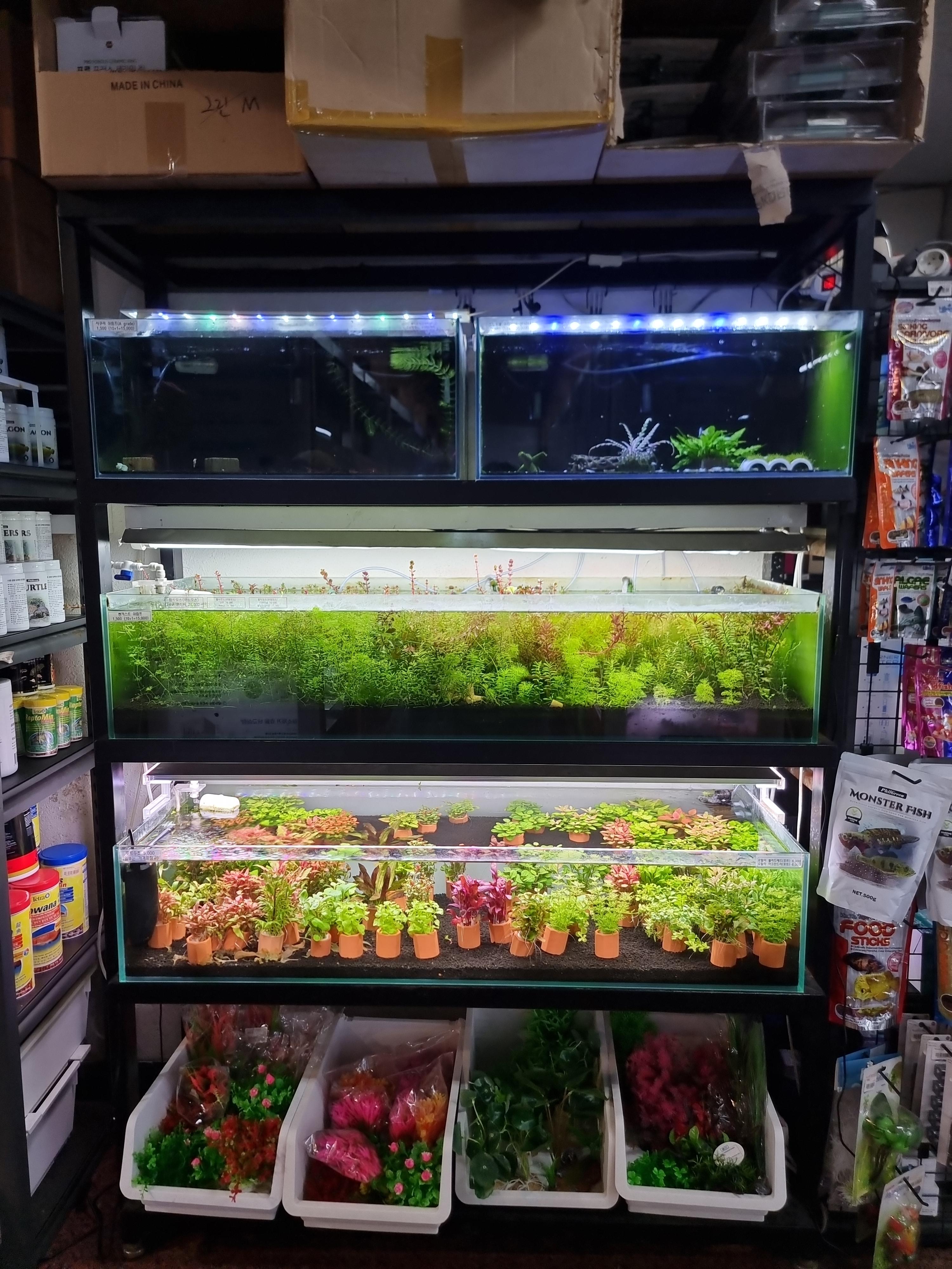 단순히 물고기를 판매하는 곳이 아니라, 어항을 꾸미는 데 필요한 모든 것을 갖춘 전문적인 매장이었음. 수초부터 장식용 돌, 조형물까지 다양한 어항 꾸미기 용품이 있어서 원하는 스타일대로 꾸밀 수 있도록 구성되어 있었음. 어항 꾸미러 오신 분들이 계셨는데 직원들이 어항 레이아웃에 대한 조언을 오며가며 해주었고, 어떤 식으로 배치하면 좋을지 추천하시면서 오랜 시간 응대 해줌. 특히, 조명과 여과기를 조합하는 방법이나 수초를 더 건강하게 키우는 팁까지 알려줘서 초보자들에게도 많은 도움이 될 것 같았음. 안타깝게도 나는 레이아웃쪽에 흥미를 갖기에는 완전 초보라 그 쪽을 아예 안봐서 사진을 안찍음ㅎ. 근데 커다란 나무도 있고 돌도 있고 이끼 같은 것이 통에 담겨서 쭉 전시되어있고, 테라리움도 있고 어마무시하더라...