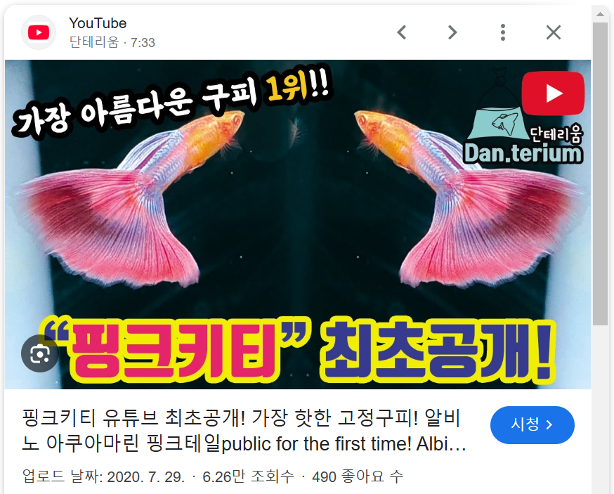 평소처럼 자기 전에 누워서 유튜브를 보다가 엄청 예쁜 물고기를 봤음. 아래 사진의 핑크키티라는 물고기인데,,, 너무 예쁜거임 ( 👇 사진 누르면 단테리움님이 올린 저 유튜브 영상으로 연결됨) .